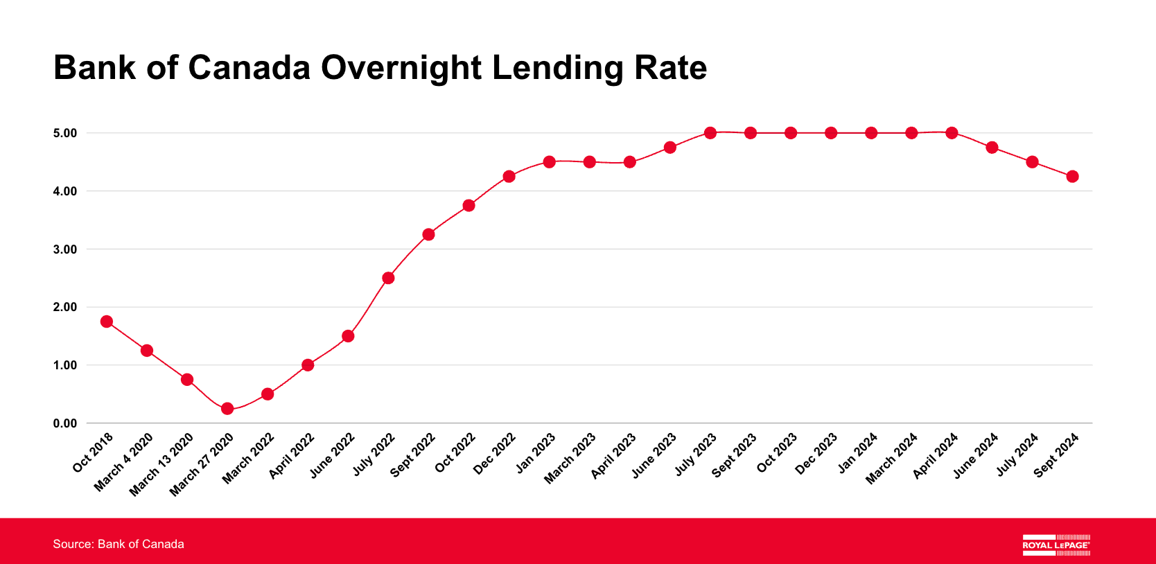In its scheduled September 2024 announcement, the Bank of Canada dropped the target for the overnight lending rate by 25 basis points to 4.25%.